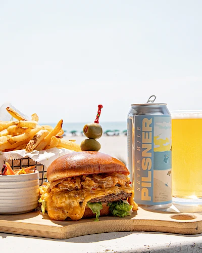 Enjoy favorites like the signature Beachside Burger, crispy fried chicken, seafood baskets, and fresh salads—or snack on wraps, chips and salsa. A kids’ menu keeps younger guests happy, while frozen cocktails and beachside drinks set the perfect laid-back tone.